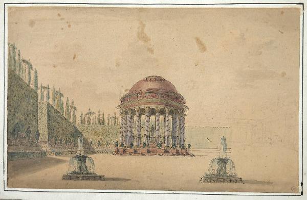 Giardino con tempietto circolare e fontane. Architettura illusionistica
