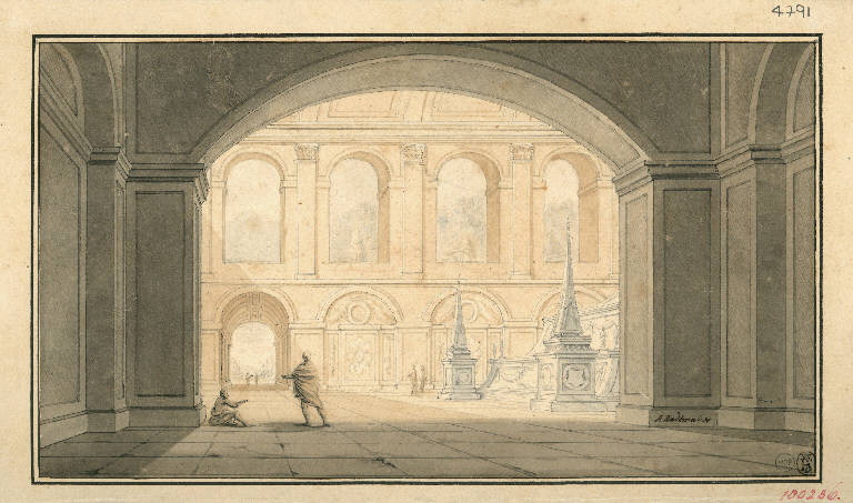 - NOTIZIE STORICO CRITICHE Questo interessante disegno che proviene dalle collezioni di Federico Augusto II Re di Sassonia, di cui compare il timbro sul disegno stesso, come riportato anche nell'iscrizione al verso (Collection Friederich August II Roi de Saxe, Dresda/ 971 M. Lugt.) è riferito, per la presenza della firma, al pittore ed incisore olandese Abraham Rademaker, nato all'incirca nel 1667-77 ad Amsterdam e morto ad Haarlem nel 1735, di cui si conservano varie opere presso la Biblioteca di Amsterdam e l'Archivio di Haarlem, che dedicò la maggior parte della sua attività alla rappresentazione delle città e del paesaggio olandesi. Non si conoscono opere dedicate al soggetto qui raffigurato, la veduta dell'interno di un palazzo con un monumento attorniato da obelischi, che si apre su uno sfondo paesaggistico, che peraltro rivela caratteri stilistici poco assimilabili con le opere del Rademaker note. Allo stesso autore è riferito anche un altro disegno di analogo tema della raccolta Lampugnani, che costituisce un pendant di questo (cfr. n. inv. 4791 b).