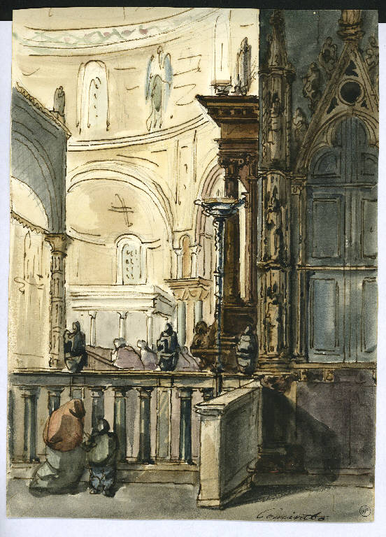 - NOTIZIE STORICO CRITICHE L'indicazione iscritta sul disegno "Cominato" non è stata identificata con autori noti. Si tratta probabilmente di uno studio eseguito di getto, forse dal vero, che presenta al verso uno schizzo a matita con una chiesa: potrebbe trattarsi dell'edificio entro cui è ambientata la scena raffigurata con le figure in preghiera dinnanzi all'altare presente al recto.