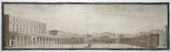 - NOTIZIE STORICO CRITICHE Nell'inventario Lampugnani il disegno è riferito dubitativamente a Luigi Vanvitelli (1700-1773) (indicazione che compare anche sul supporto per mano del collezionista) il grande architetto chiamato a Napoli da Carlo VII di Borbone, futuro Carlo III di Spagna, per la realizzazione della Reggia di Caserta ed assai attivo nella città partenopea. Particolare per l'insolito formato allungato e per l'attenta esecuzione ad acquerello il disegno, la cui attribuzione non è certa, è interessante in quanto testimonia l'aspetto di piazza del Plebescito prima della costruzione della chiesa di San Francesco di Paola (1817-46).