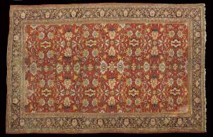 - NOTIZIE STORICO CRITICHE Il tappeto non è stato visionato. L'attribuzione e la datazione sono basate solo sull'analisi stilistica.\nIl termine Mahal indica un tappeto Saruq (villaggio al confine della regione Ferahan) ma di seconda qualità che si caratterizza, come in questo caso, per nitidezza e regolarità che non degenera in rigidezza. I tappeti Saruq non vengono annodati nell'omonimo villaggio bensì in una regione molto vasta che circonda la vecchia capitale della provincia Arak, precedentemente chiamata Sultanabad.