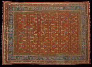 Tappeto con decorazione floreale. Il campo rosso del tappeto è decorato dal disegno herati presentato in una versione piuttosto stilizzata. Una rosetta azzurra è racchiusa in un'irregolare cornice romboidale. In corrispondenza di ciascun vertice del rombo insistono fiori azzurri e altre palmette sui toni del verde. Parallele ai quattro lati del rombo stesso sono presenti altrettante foglie falciformi dal profilo seghettato. La cornice è abbastanza ampia e, complessivamente, in buona armonia con la parte rimanente dl tappeto. Consta di un bordo interno bipartito, uno esterno tripartito e di una fascia centrale. Quest'ultima è decorata da uno stelo con foglie verdi, alternate a motivi geometrici quadrangolari e da altri costituiti da triangoli sovrapposti. Il bordo interno è costituito da una sottile fascetta con piccole roselline bianche su fondo rosso e da una seconda bordura che alterna foglie dal profilo a zigzag a motivi geometrici. Queste decorazioni si ripetono nella bordura esterna alla quale si aggiunge una fascetta dove insiste un fregio floreale su fondo beige chiaro. L'intero tappeto è, infine, profilato da una bordura rossa. \nOrdito: cotone; Trama: lana; Pelo: lana; Nodo: simmetrico; Densità: 600 nodi al dm2 ca.