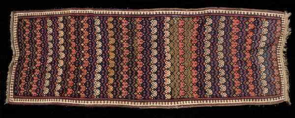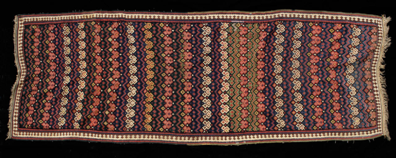 Il campo è composto di strisce orizzontali a colori alterni decorate da motivi geometrici e separate le une dalle altre da strisce dal profilo a zigzag. Il campo è interamente bordato dal semplice motivo detto laleh abrassi. I fili dell'ordito sono suddivisi in gruppi e annodati secondo un uso tipicamente curdo.\nKilim realizzato con la tecnica cosiddetta a "fessure".