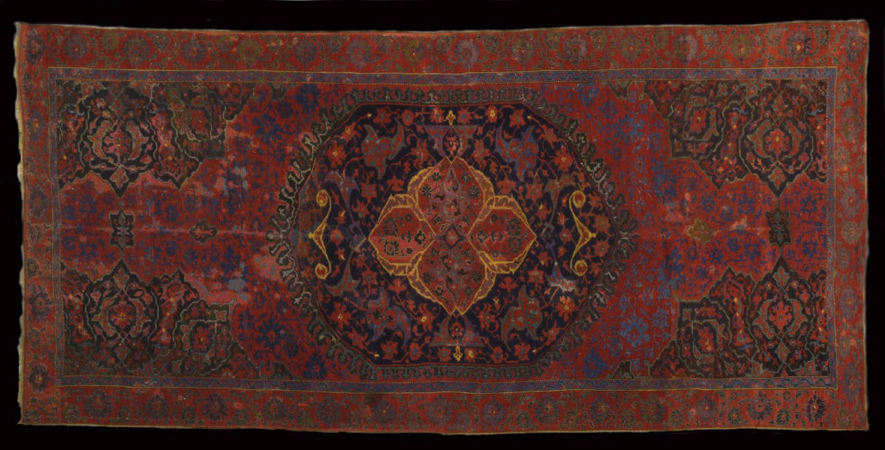 Al centro del campo fittamente percorso da un minuto tralcio vegetale con fiori di loto, palmette e tipiche "foglie di quercia" dal caratteristico profilo frastagliato è collocato un medaglione ogivale ma leggermente schiacciato e ornato da arabeschi e palmette. La rimanente porzione del campo è occupata da una porzione di altri quattro medaglioni secondari polilobati collegati da pendenti che suggeriscono un andamento ripetuto all'infinito. La cornice è costituita da una fascia centrale e da un bordo secondario più sottile. La bordura più larga è costituita da motivi floreali dove si riconoscono palmette e grossi fiori tondeggianti dal profilo leggermente frastagliato. Il bordo sottile è decorato con un tralcio vegetale continuo e fogliato. \nOrdito: lana; Trama: lana; Pelo: lana; Nodo: simmetrico; Densità: 1800 nodi al dm2 ca.