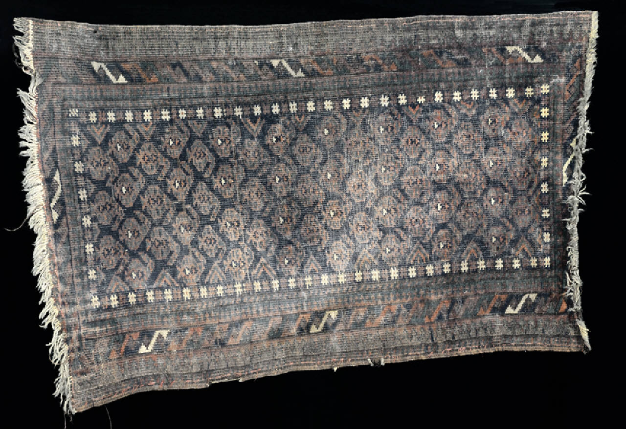 Il piccolo manufatto versa in cattive condizioni di conservazione. Sono presenti numerosi e vistosi danni su tutta la superficie e anche le cimose risultano molto rovinate. \nIl campo è completamente ornato da boteh sfalsati fra file contigue e di direzione alterna. La cornice è costituita da una fascia centrale ornata da motivi geometrici disposti in diagonale e da alcuni bordi dei quali non si distinguono i motivi decorativo. La sottile bordura del campo reca dei motivi floreali stilizzati disposti a colori alterni.\nOrdito: lana; Trama: lana; Pelo: lana; Nodo: simmetrico; Densità: 900 nodi al dm2 ca.