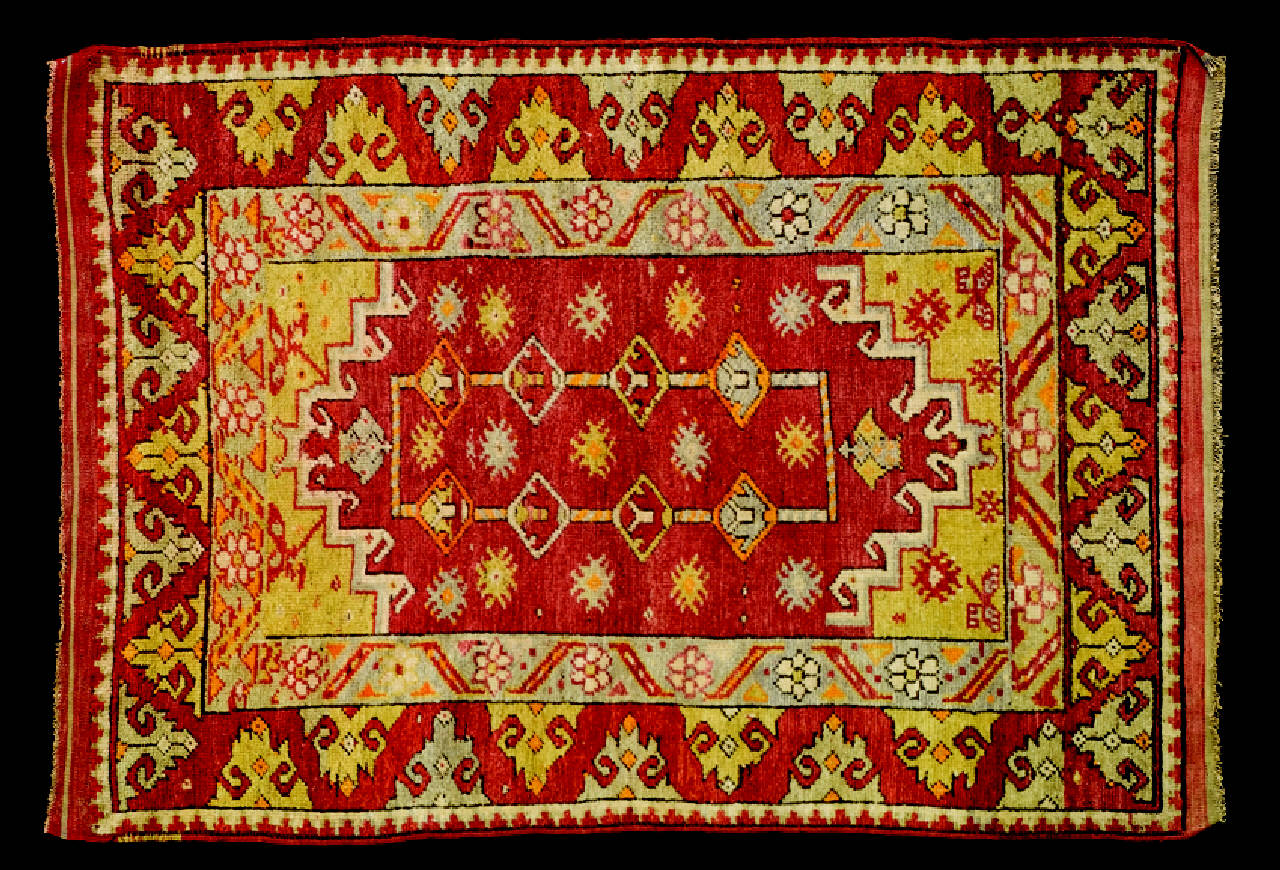 Tappeto a decorazione geometrica. Il tappeto, entrato a far parte della collezione museale come Shirvan, è riconducibile alle manifatture della città di Bergama. Infatti, molto caratteristici della zona sono proprio i tappeti decorati, come in questo caso, con impianto a doppia nicchia con il centro occupato da motivi geometrici e floreali molto stilizzati. \nQuesto tappeto è caratterizzato da una versione molto geometrizzata dell'antico impianto a doppia nicchia dei cosiddetti Transilvani del XVII secolo. Il campo è bordato da una cornice costituita da tre fasce affini a quelle dei tappeti caucasici. Quella più interna è decorata da fiori e foglie disposte in diagonale. La seconda, più larga, presenta elementi triangolari simili a punte di freccia. Il tappeto è chiuso da una minuta cornice con un motivo vicino al medachyl. \nLungo i lati corti è presente una fascia in tessuto di circa 5 cm. Decorata da strisce rosse e beige. Sul tappeto è presente un piccolo piombo di circa 6 mm. che reca l'iscrizione: "Istanbul *oda*" (si tratta probabilmente del piombo doganale dell'importazione).\nOrdito: lana, Trama: lana; Pelo: lana; Nodo: simmetrico; Densità: 1200 nodi al dm2