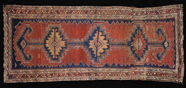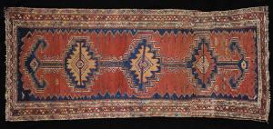 Tappeto a decorazione geometrica. Il campo blu è dominato da una forma geometrica allungata, un rettangolo rosso dal bordo smerlato contenente tre imponenti medaglioni collegati tra loro e terminanti con un motivo grossomodo a forma di freccia. Questi uncini sembrano tipici della produzione tribale e potrebbero essere interpretati come una rappresentazione molto stilizzata di teste di capra o di montone. I tre medaglioni centrali sono romboidali e presentano il profilo a gradini e uncini. Al centro di ciascun rombo sono rappresentate delle figure geometriche simili ai gul centroasiatici che, a loro volta, ospitano altre losanghe concentriche. Il resto del campo è decorato con motivi geometrici. La cornice consta di una fascia centrale seguita da due bordi solo leggermente più stetti e caratterizzati dalla medesima decorazione geometrica con motivi triangolari a colori alterni. Il tappeto è stato tagliato e riannodato.\nOrdito: lana, Trama: lana; Pelo: lana; Nodo: simmetrico; Densità: 1200 nodi al dm2