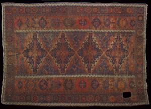 Il campo, con fondo rosso, è suddiviso verticalmente in tre parti. Nella sezione centrale sono presenti quattro medaglioni romboidali di color indaco con contorno a nodi bianco. Le porzioni di dieci spicchi laterali azzurri completano la decorazione di questa porzione di campo. Le due colonne laterali, separate da quella mediana da un bordo a teste di falco avorio su fondo azzurro, sono ornate da elementi decorativi stilizzati che sembrano quasi versioni rimpicciolite del medaglione del Kazak ad aquile. La cornice, listata da due fascette sottili che ripresentano il motivo delle teste di falco, mostra gul ottagonali intervallati da triangoli opposti al vertice. La decorazione della cornice è abbastanza comune nei sumakh caucasici (cfr. SOTHEBY'S 1988, p. 33, fig. 68).\nTappeto caucasico piatto (cioè privo di vello) da pavimento eseguito con fili che agganciano ad anello più catene dell'ordito. Manufatto a decorazione geometrica.