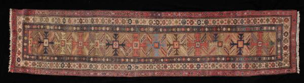 - NOTIZIE STORICO CRITICHE Il tappeto proviene dall'area di Sarab, cittadina mercantile situata tra Ardebil e Tabriz. Centro di produzione di tappeti, Sarab è conosciuto per la produzione di passatoie anche di lunghezza rilevante (raggiungono i sei metri e oltre). I disegni, come visto, sono perlopiù geometrici e d'influenza caucasica.