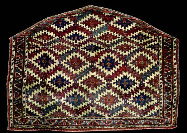 Il manufatto è una coperta ornamentale dalla caratteristica forma pentagonale (asmalyk) utilizzata per ornare i fianchi del cammello. La superficie della coperta presenta losanghe romboidali dal profilo seghettato (ashik). Tali forme sono inserite in un reticolo. Il motivo a "punta di freccia" alternata nelle due direzioni che decora la bordura principale sembra tipico della produzione degli Yomut Jafarbai stanziatisi nella regione a sud-est del Mar Caspio. La decorazione dei bordi che affiancano la cornice principale è costituita da minuti contigui motivi geometrici. \nGli Yomut formavano nel XIX secolo assieme ai Tekke e agli Ersari una delle più importanti e numerose tribù del Turkestan occidentale.\nEsemplare simile al n. inv. ISL 00285.\nOrdito: lana; Trama: lana; Pelo: lana; Nodo: simmetrico; Densità: 3600 nodi al dm2\n(cfr. n. 216)