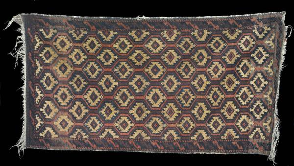Tappeto a decorazione geometrica. Nel campo sono presenti quattro file di esagoni dal bordo rosso e contenenti motivi di losanga dai contorni a scala (gul) su fondo beige. La cornice reca un motivo ripetuto bande oblique di specie di S fortemente stilizzate dai colori diversi. Il tappeto è stato ricondotto all'Asia centrale con un riferimento preciso al Baluchistan.\nOrdito: lana; Trama: lana; Pelo: lana; Nodo: asimmetrico; Densità: 2000 nodi al dm2