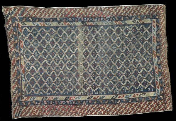 Tappeto a decorazione geometrica. I numerosi tappeti dell'area di Shirvan (Caucaso centro-orientale) si distinguono per la loro varietà decorativa. Infatti, queste regioni furono sottoposte a varie invasioni, causa prima dell'eterogeneità dei motivi usati nella decorazione di questi manufatti. \nIl campo è interamente decorato da motivi ashik, ricorrenti nei tappeti turkmeni, inseriti entro un reticolato di losanghe romboidali ripetuto all'infinito. L'inevitabile monotonia dello schema compositivo è vivacizzata dalla cornice tripartita. La fascia esterna, più ampia, presenta sottili fascette diagonali rosse e color avorio e decorate con minuti motivi romboidali. Il bordo interno presenta motivi a S. Minuti garofani stilizzati, alternati nella direzione e congiunti da steli azzurri decorano la fascia mediana (cfr.: D. EDER - E. ASCHENBRENNER 2000, p. 218, fig. 115). Al centro è presente una fascia di circa 5 centimetri che presenta una variazione d'intensità dello stesso colore (effetto abrash). \nOrdito: lana; Trama: lana; Pelo: lana; Nodo: simmetrico; Densità: 1600 nodi al dm2 ca.