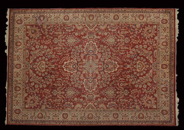 Tappeto a decorazione floreale. Il campo rosso del tappeto è costellato da una composizione costituita da palmette circondate da una profusione di piccole decorazioni floreali che va infittendosi verso il centro formando una sorta di medaglione. La cornice è costituita da una fascia centrale e da due bordi laterali, dei quali quello più esterno bipartito. La fascia centrale è decorata con palmette, rosette e foglie lanceolate. \nIl tappeto in esame evidenzia un preciso riferimento ai motivi decorativi e compositivi persiani ma pare essere un tappeto prodotto in India nella città di Agra. I tappeti provenienti da Agra, oltre che da Amritzar, Mirzapur e Srinagar, sono prodotti commerciali nella migliore delle ipotesi databili attorno alla fine del XIX secolo.\nOrdito: cotone; Trama: cotone; Pelo: lana; Nodo: asimmetrico; Densità: 1000 nodi al dm2 ca.