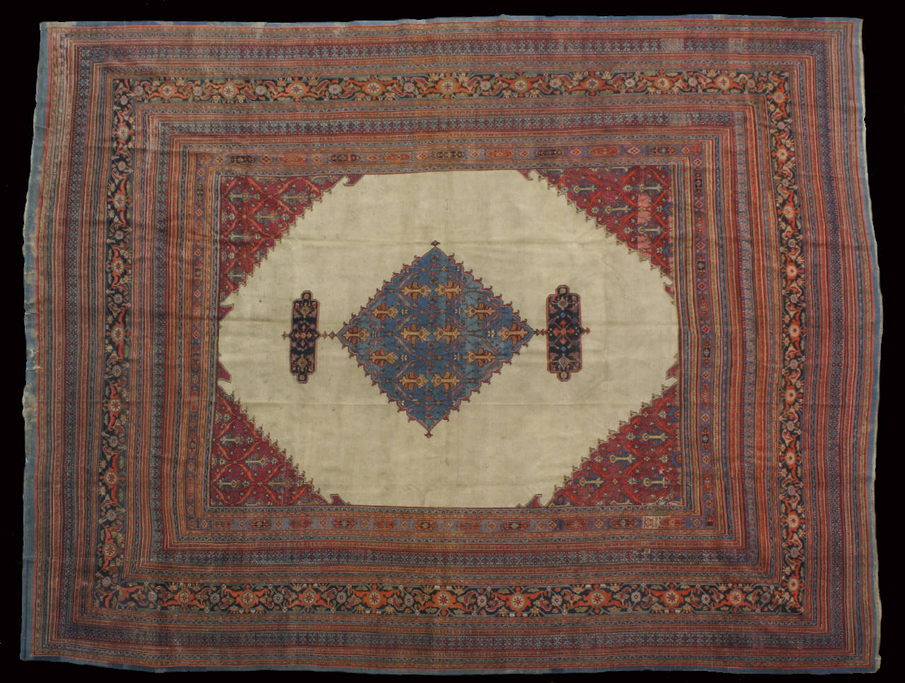 Tappeto a medaglione. Il campo del tappeto è dominato da un ottagono contenente al centro un medaglione romboidale con due pendenti a forma di cartiglio. Il medaglione, definito da un contorno a uncini, è riempito da dodici motivi ornamentali entro uno schema a losanga. Lo stesso motivo, solo su fondo rosso, si ritrova nei quattro cantonali. \nLa cornice è notevolmente ampia e importante. E' costituita da una fascia centrale ornata da palmette e roselline e da numerosi bordi alcuni dei quali decorati da cartigli.\nOrdito: cotone; Trama: cotone; Pelo: lana; Nodo: asimmetrico; Densità: 750 nodi al dm2 ca.