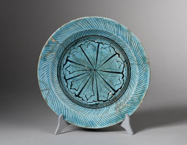Piatto circolare di tipo Kubachi in pasta artificiale ("fritta") decorata in nero sotto invetriatura turchese.