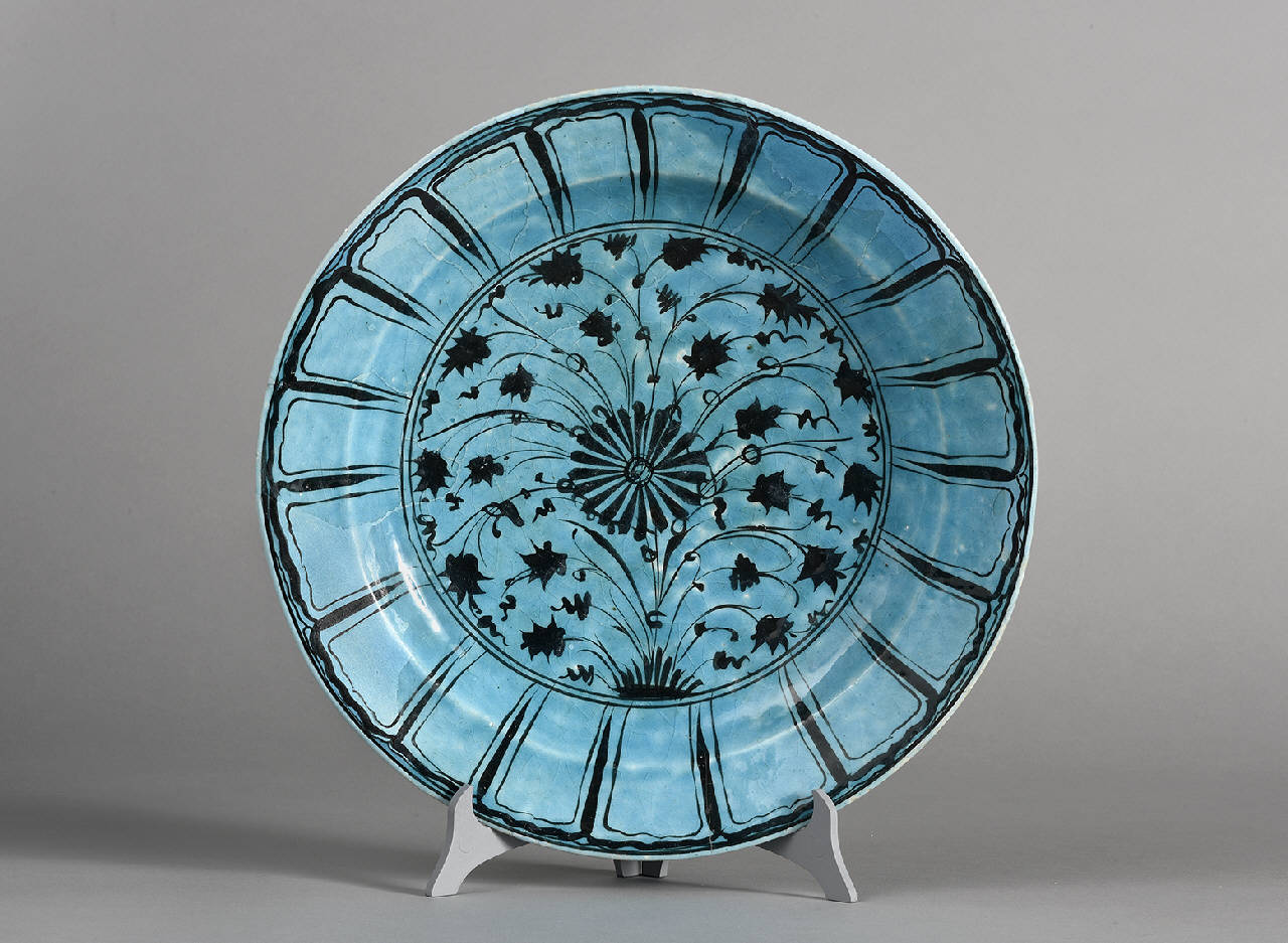 Piatto circolare di tipo Kubachi in pasta artificiale ("fritta") decorata in nero sotto invetriatura turchese.