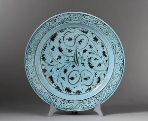 Piatto circolare di tipo Kubachi in pasta artificiale ("fritta") decorata in nero sotto invetriatura turchese. Il piatto è decorato da viticci e steli raffinati terminanti con foglie entro una sottile cornice circolare. La tesa del piatto presenta un elegante ornato filiforme racchiuso da una filettatura circolare. \nCraquelé sull'intera superficie.
