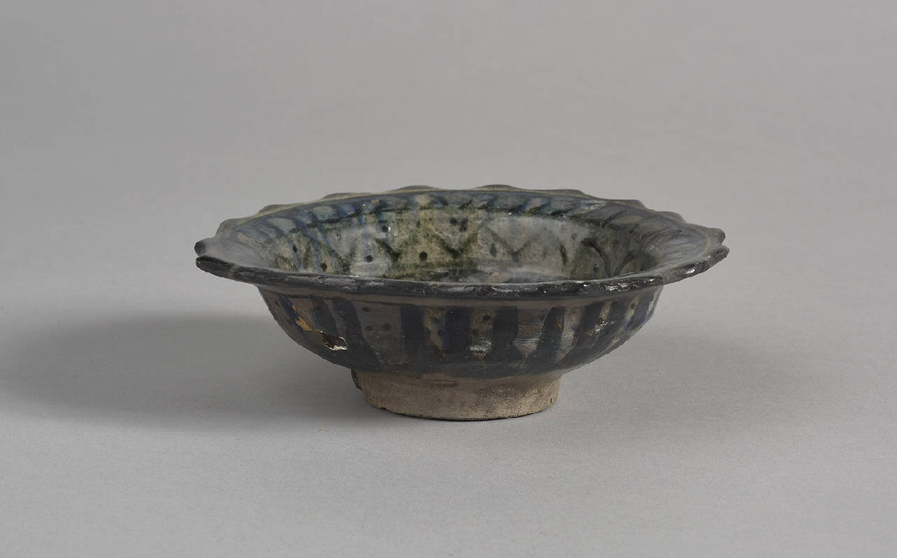 Coppetta con basso piede e profilo ondulato. La decorazione consiste in tralci fogliati e palmette. La tesa è decorata con un fregio di foglie.