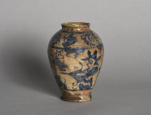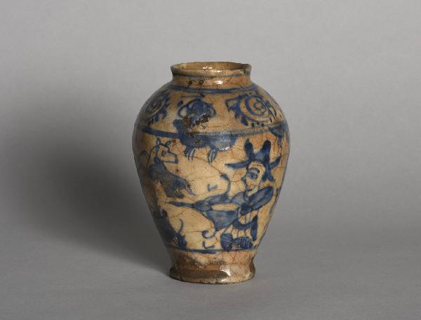 Vaso piriforme con bocca cordonata decorato in blu sotto invetriatura trasparente. Il corpo del vaso è ornato da un'ampia fascia centrale abitata da animali e da un arciere e da un secondo personaggio che tiene in mano una scimitarra. Sovrapposta, una fascia decorata con motivi astratti.