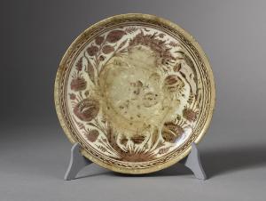 - NOTIZIE STORICO CRITICHE La coppa è realizzata in lustro metallico, tecnica decorativa applicata utilizzata a partire dalla metà del IX secolo. Si trattava di una composizione a base di sali d'argento e rame applicata sullo smalto già cotto. L'oggetto così decorato veniva rimesso in forno, in atmosfera povera di ossigeno: i sali penetravano nella superficie della vetrina e prendevano quel caratteristico colore metallico di varia tonalità, fra il dorato e il rosso rame. \nCon il periodo safavide, oltre alla massiccia produzione di vasellame blu e bianco d'imitazione estremo orientale, si riscopre la tecnica del lustro. Come si può vedere dall'oggetto in esame, la qualità delle realizzazioni non può essere confrontato con i prodotti dei secoli XIII e XIV. \nUna coppa pressoché uguale in dimensioni e decorazioni è stata presentata in un'asta Sotheby's (cfr. SOTHEBY'S 1990, n. 160).