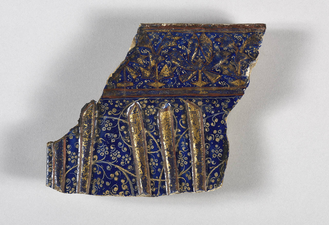 - NOTIZIE STORICO CRITICHE In origine questo piccolo frammento doveva far parte di un fregio calligrafico che, a sua volta, faceva parte di un complesso più grande, forse un mihrab. Il contrasto cromatico rendeva questi pannelli straordinariamente eleganti. Il frammento in esame è un tipico esempio di ceramica lajvardina (termine derivato dal persiano che significa "lapislazzulo" e allude al colore degli smalti). In epoca mongola, questa ceramica subentrò alla tipologia mina'i con la quale aveva delle notevoli affinità tecniche (decorazione a smalto sopra vetrina seguita da una seconda cottura a temperatura moderata).
