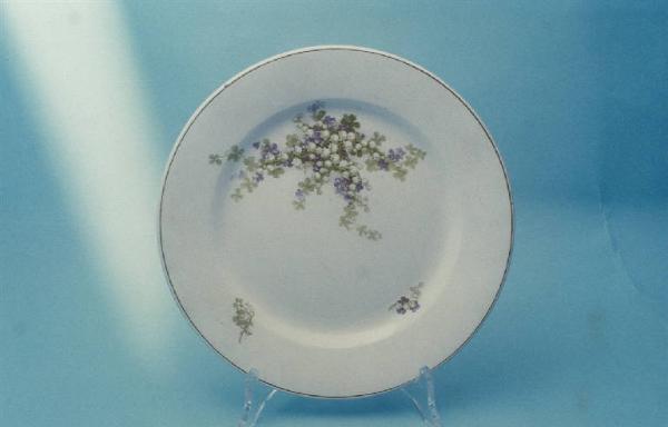 Piatto piano color avorio di forma circolare; decorato con motivo floreale (viole e bucaneve) in verde, viola e bianco. Bordo rifinito in oro.