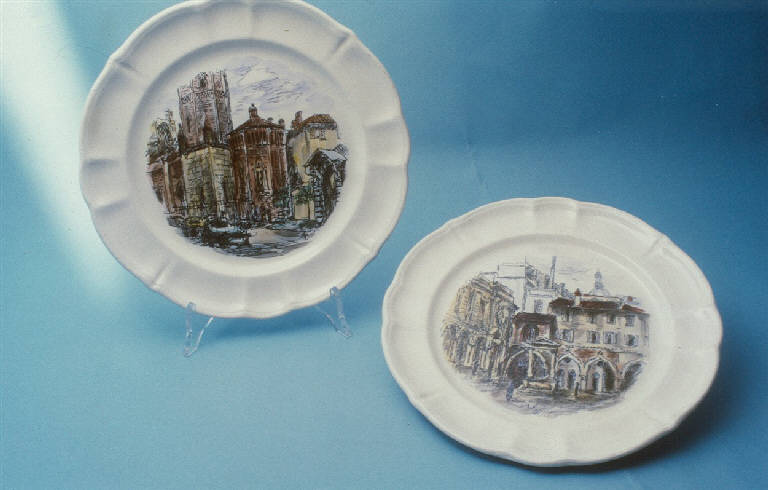 Servizio di piatti composta da due piatti color avorio con bordo a rilievo decorati al centro con vedute di Milano.