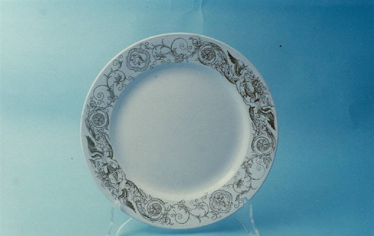 - NOTIZIE STORICO CRITICHE Il Morazzoni considera il marchio S. C. R. (Società Ceramica Richard) in uso dal 1873 (cfr. "La terraglie italiana"). Il termine "Raffaellesco" presente nell'iscrizione a tergo del piatto indica il tipo di decoro (sequenze o intrecci di elementi architettonici, vegetali, animali, di festoni e figure fantastiche ripresi da Raffaello). Si tratta di motivi ornamentali molto usati dai ceramisti di Urbino dalla metà del XVI secolo poi ripresi dalla Richard dalla metà dell'Ottocento. In quel periodo la manifattura, oltre che per la raffinatezza delle sue porcellane, era nota per la bellezza e la perfezione delle sue decorazioni raffaellesche. Nell'oggetto in esame il decoro, in monocromo color bruno, è realizzato con la tecnica della decalcomania sottosmalto.