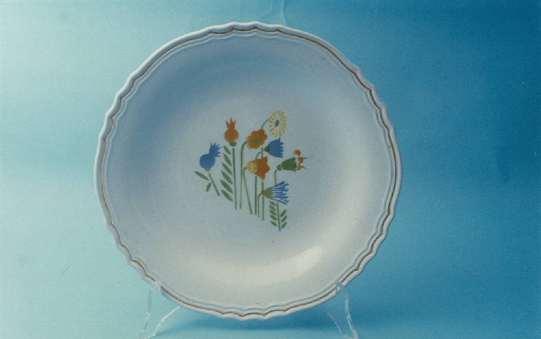 Piatto da portata con tesa crestata e mistilinea; bordo rifinito con filettatura arancio; fondo bianco avorio decorato al centro con motivo floreale in verde, arancio, azzurro e giallo.