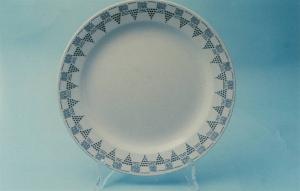 Piatto piano circolare; fondo bianco con motivi decorativi vegetali stilizzati (foglie e grappoli d'uva) in blu lungo l'ala.