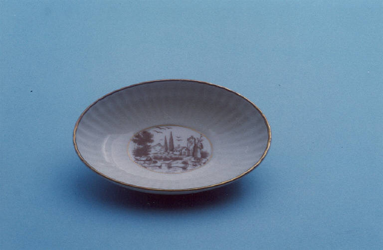 Posacenere di forma ovale; fondo bianco con paesaggio campestre in monocromo bruno al centro; bordo rifinito con filettatura oro.