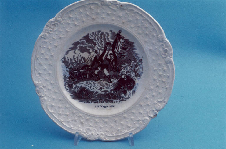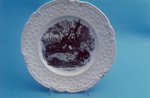 - NOTIZIE STORICO CRITICHE Il piatto in esame, facente parte di un servizio da dodici (nn. inv. 1616-1627), è stato prodotto dalla Richard indicativamente tra gli anni '60 e '70 dell'Ottocento. La formula completa del punzone a tergo, oggi solo parzialmente leggibile, è "RICHARD SON BARONA". Secondo il Morazzoni (cfr. "La terraglia italiana", 1956 ?) questo marchio venne impresso solo fino al 1848. Le scene nei cavetti, raffiguranti episodi della storia italiana avvenuti tra il 1859 e il 1860, sono evidentemente più tarde: la presenza di una di esse in un piatto prodotto dalla Richard tra il 1859 e 1870 nello stabilimento di San Cristoforo (cfr. "La terraglia italiana", p. 148) ipotizza una datazione coeva. E' quindi possibile che nello stabilimento di Barona, una località vicino Milano, sia rimasta una giacenza di piatti poi ripresi e dipinti tra gli anni '60 e '70. Nel cavetto del piatto in esame è raffigurata, attraverso la tecnica della decalcomania sottosmalto in monocromo color nero, la battaglia di Palestro. Dopo il conflitto di Montebello del 20 maggio 1859, l'esercito franco-piemontese si spostò verso Novara, intento a raggiungere Milano. La mattina del 30 maggio i piemontesi attraversarono il fiume Sesia e furono in grado di prendere e mantenere il controllo delle città di Palestro, Confienza e Vinzaglio. Il giorno successivo, per testare le vere intenzioni del nemico, il maresciallo Fredrick Zobel ordinò di attaccare Palestro con due divisioni di fanteria. La vittoria fu dei piemontesi, che proseguirono gli attacchi a Magenta.