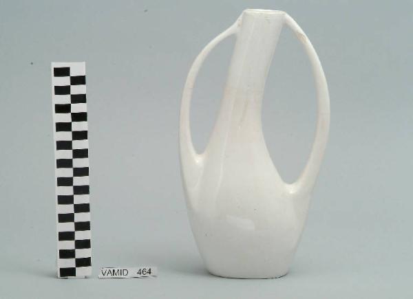 Vaso con lungo collo terminante con beccuccio circolare; due manici; fondo bianco lucido uniforme.