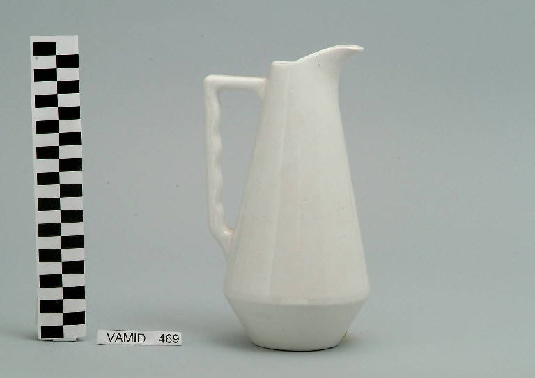 Brocca con piede circolare; beccuccio sporgente; manico squadrato; fondo bianco uniforme.