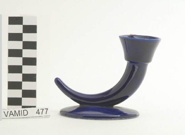 Piccolo candeliere da tavolo smaltato color blu cobalto. Base circolare liscia sormontata da portacandela a forma di piccola cornucopia terminante con bocciolo leggermente svasato.
