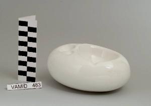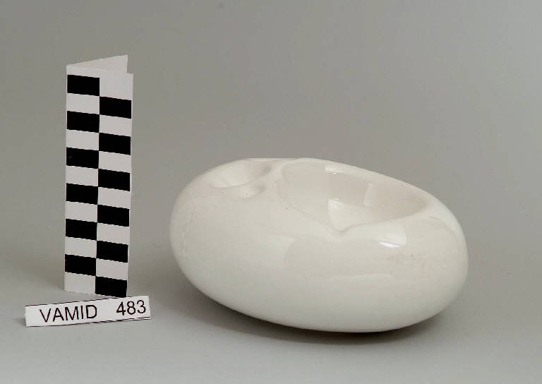 Posacenere a forma di pietra ovoidale con cavità; fondo bianco uniforme.