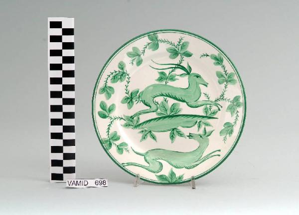 Piatto circolare; fondo bianco decorato con stambecchi e motivi vegetali in verde; bordo rifinito con filettatura verde.