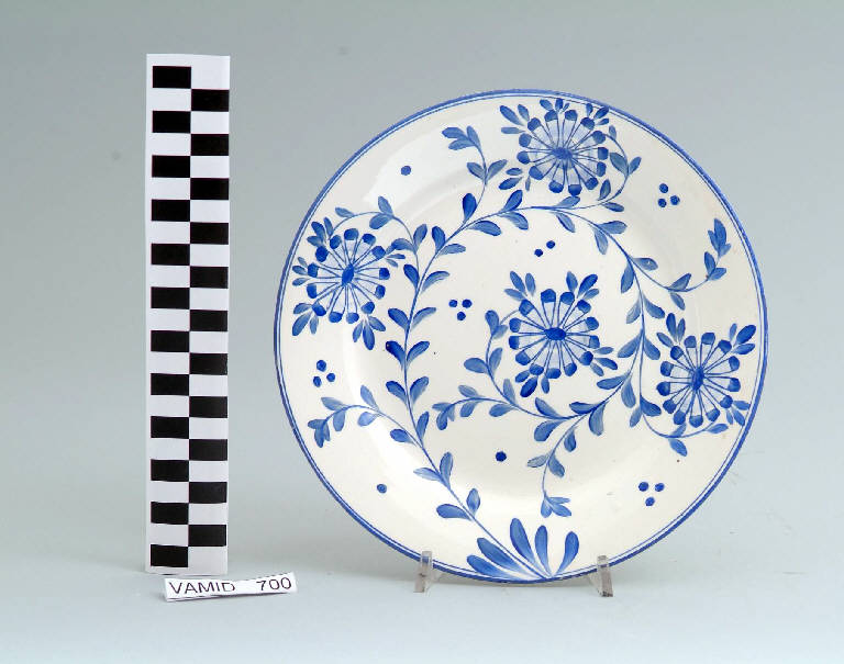 Piatto circolare; fondo bianco decorato con motivo vegetale stilizzato; bordo rifinito con filettatura blu.