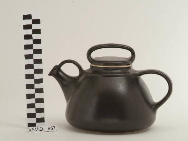 Teiera con corpo globulare; beccuccio sporgente; manico liscio; coperchio circolare con presa apicale; fondo nero opaco.