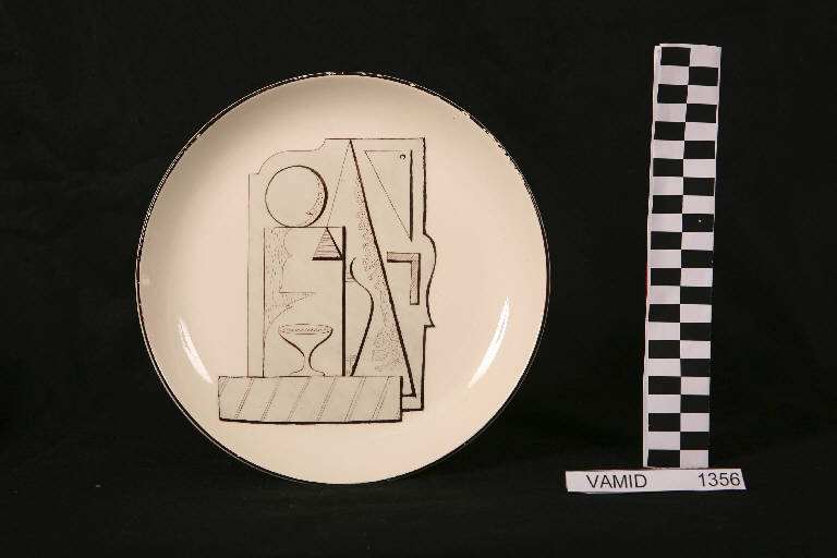 - NOTIZIE STORICO CRITICHE Il piatto, dipinto a mano, fu eseguito nell'ambito delle "esercitazioni" che si svolgevano nella Scuola per Ceramisti di Laveno, istituita nel 1950 e chiusa nel 1963. Gli insegnamenti avevano luogo nei locali della Società Ceramica Italiana ed erano gestiti dalla società stessa. Sotto il piede compaiono la data e la firma dell'allievo che eseguì il piatto (Maffeis E.). Nel Museo di Laveno sono conservati altri pezzi simili (nn. inv. 1347, 1349-1355, 1357-1366).