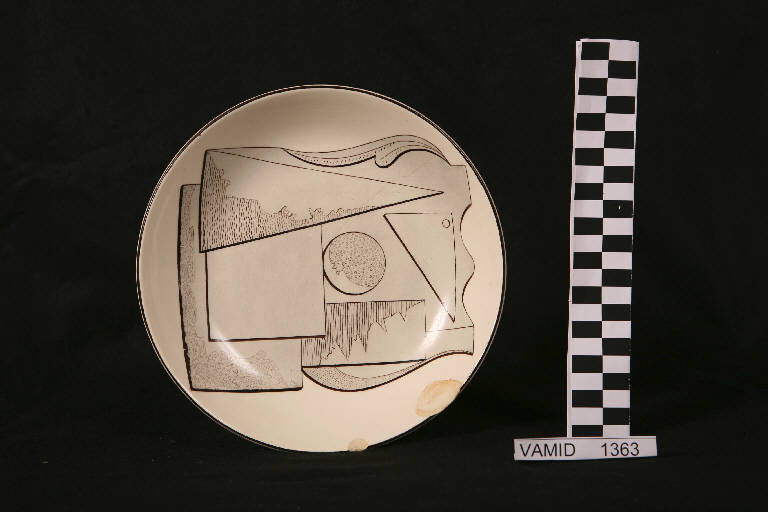 - NOTIZIE STORICO CRITICHE Il piatto, dipinto a mano, fu eseguito nell'ambito delle "esercitazioni" che si svolgevano nella Scuola per Ceramisti di Laveno, istituita nel 1950 e chiusa nel 1963. Gli insegnamenti avevano luogo nei locali della Società Ceramica Italiana ed erano gestiti dalla società stessa. Sotto il piede compaiono la data e la firma dell'allievo che eseguì il piatto (Andrighetto). Nel Museo di Laveno sono conservati altri pezzi simili (nn. inv. 1347, 1349-1362, 1364-1366).