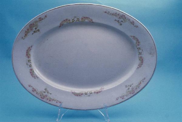 Piatto da portata di forma ovale; fondo bianco avorio con decorazione floreale lungo la tesa nei colori rosa e verde; bordo rifinito con filettatura oro.