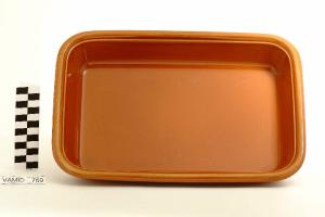 Pirofila rettangolare; angoli arrotondati; bordo estroflesso; fondo marrone.