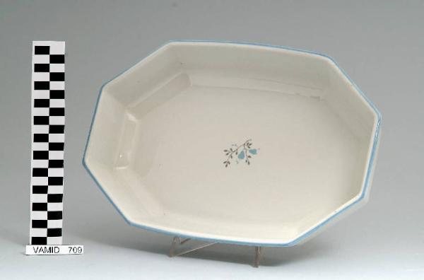 Pirofila a sezione ottagonale con motivo a corda sull'orlo e dentellatura prima del piede; fondo bianco con motivo vegetale stilizzato in grigio e azzurro; bordo rifinito in azzurro.