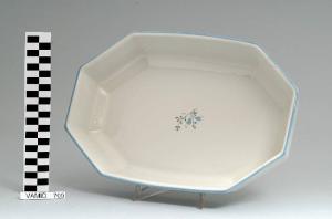 - NOTIZIE STORICO CRITICHE La pirofila, appartenente ad un servizio da tavola composto da sei elementi (nn. inv. 709-714), è realizzata nella forma "Belvedere". Tipologicamente si lega ad un servizio da caffè (nn. inv. 715, 718-719) e ad un servizio da thè (nn. inv. 716-717, 720-721). Come riporta il cartellino applicato sull'oggetto num. inv. 710, il servizio venne realizzato dalla Richard Ginori nella fabbrica di Laveno. Pertanto si ipotizza una datazine post 1965, anno della fusione della Richard Ginori con la S.C.I.