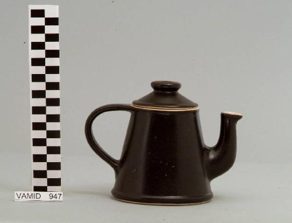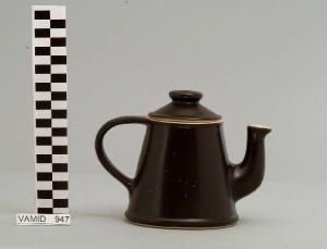 Caffettiera con base circolare; beccuccio sporgente; manico a "C"; coperchio circolare con pomolo apicale; fondo nero opaco.