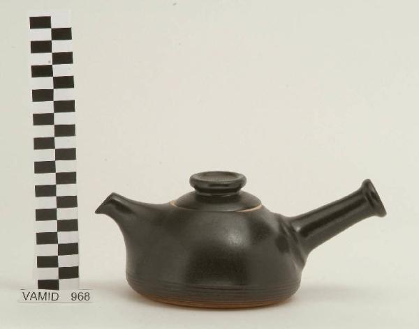 Teiera con corpo globulare; beccuccio sporgente; manico liscio; coperchio circolare con pomolo apicale; fondo nero opaco.