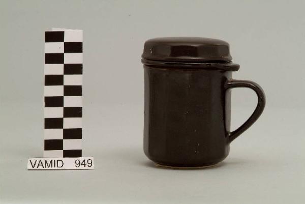Tazza da tisana dotata di filtro con corpo cilindrico; manico liscio; coperchio circolare; fondo nero opaco.