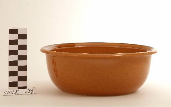 Pirofila circolare; bordo estroflesso, fondo marrone con piccoli granelli neri; bordo rinito in nero.