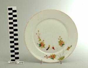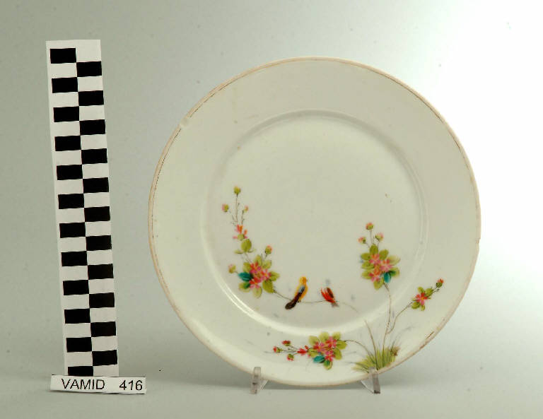 Piatto circolare; fondo bianco con tralcio fiorito e uccellini in marrone, verde, rosso, giallo, rosa e azzurro in posizione decentrata; bordo rifinito con filettatura oro.